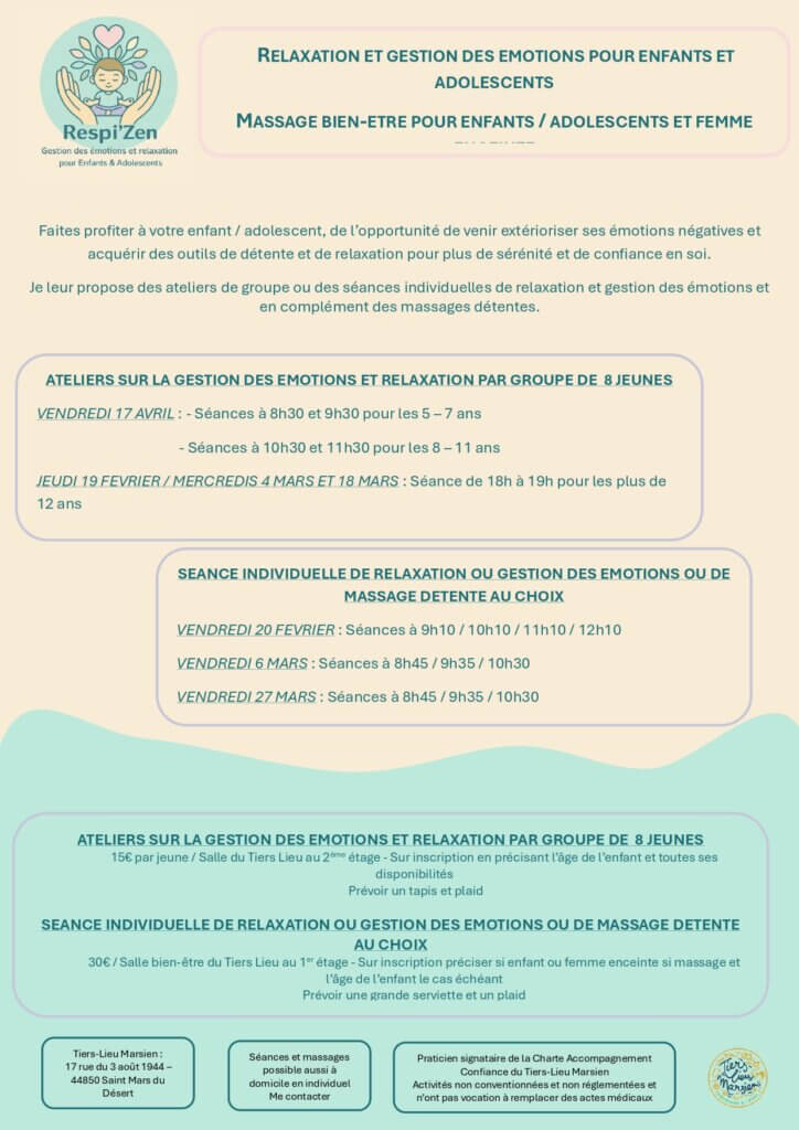 Elle propose également des massages « détente » pour femme enceinte / enfant / adolescents et des ateliers de massage parents / bébé. La détente et la relaxation commencent dès le plus jeune âge.