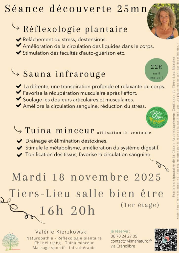 Vk Manaturo , Valérie Kierzkowski-Demoineret vous propose des séances découvertes de 25mn de réflexologie plantaire, de sauna infrarouge ou de tuina minceur. Chaque pratique vous apportera du bien-être par le relâchement ou la stimulation.